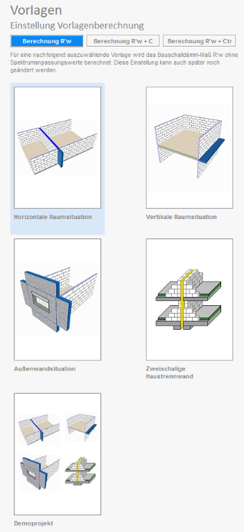 Beim Starten des Kalksandstein-Schallschutzrechners Version 5.05 öffnet sich eine Vorlagenauswahl, über die u.a. Beispiele für die einzelnen Übertragungssituationen geöffnet werden können.