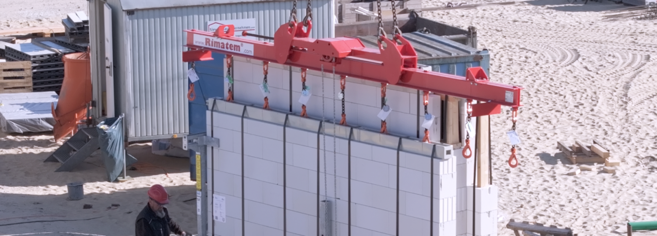 Het transport en de montage van de prefab wanden gebeurt volgens DIN 1053-4 met behulp van bandstalen hijsbanden die de wanden volledig omsluiten. Het aanhaken /aanpikken van de wanden dient, ongeacht het bestaande transportsysteem, te worden uitgevoerd met behulp van het Rimatem Vario transportsysteem, bestaande uit een Vario kraantraverse en één of meerdere Vario wandtraversen welke aan de bovenkant van de wanden zijn gemonteerd.